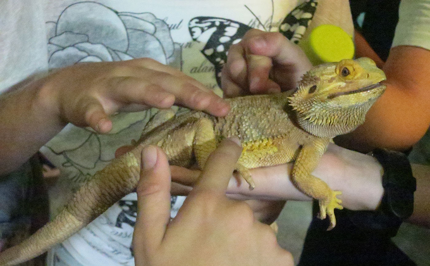 Nach dem Film ging es zu den Piranhas, die der Chef des Reptiliums einst auf Ebay gekauft hatte. Danach öffnete unsere Gruppenleiterin ein Terrarium mit Schildkröten, die auch,, pancake turtles„ genannt werden, da ihr Panzer sehr flach ist. So können sie sich in Felsspalten verstecken. Danach gingen wir zu einem Terrarium, in dem die Reptilien aus Australien leben, zum Beispiel die Bartagame. Wir erfuhren interessante Details über die Reptilien, z.B. dass ein zweites Augenpaar oben auf derm Kopf sitzt, damit die Tiere Gefahren wie Raubvögel rechtzeitig bemerken können. Danach durfte man die Bartagame streicheln. Dann ging es weiter zu den größten Schlangen der Welt, den Netzpytons. Sie waren sechs Meter lang und über 50kg schwer. Eine war braun, die andere war gelb.