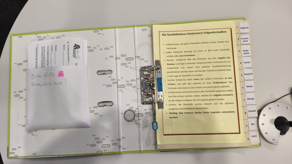 - Im Vorraum des Lehrerzimmers befindet sich ein Ordner, der für alle Schüler zugänglich ist.