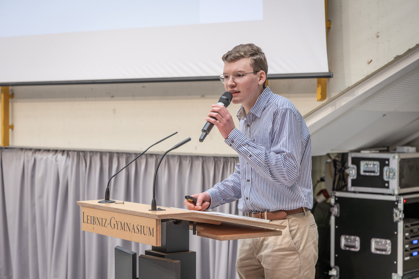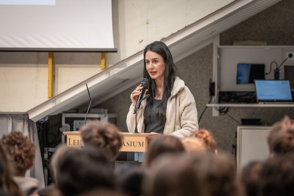 Zu Beginn der sechsten Stunde traf sich die gesamte neunte Jahrgangsstufe nochmals in der Aula. In einer kurzen Rede bedankte sich unsere Schulleiterin Frau Susanne Christ bei den KooperationspartnerInnen für ihren Einsatz an unserer Schule und überreichte ihnen eine kleine Aufmerksamkeit. Anschließend stellte unser Schülersprecher Leonard Weinmann die Aktion Tagwerk vor, die in diesem Jahr am Dienstag, den 28. 4. 2026, bei uns am LGÖ stattfindet und bei der unsere NeuntklässlerInnen die Gelegenheit haben, für einen guten Zweck schon mal ein „Minipraktikum“ vorab zu absolvieren. Den Abschluss bildete eine kurze Feedbackrunde zum Infotag im Klassenverband, bei der sich herausstellte, dass unsere SchülerInnen den Infotag insgesamt hilfreich fanden.