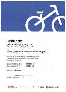 Das Leibniz-Gymnasium konnte im Rahmen der Sonderaktion Schulradeln mit 10.871 gefahrenen Kilometern den ersten Platz knapp vor der Silcher-Grundschule belegen.