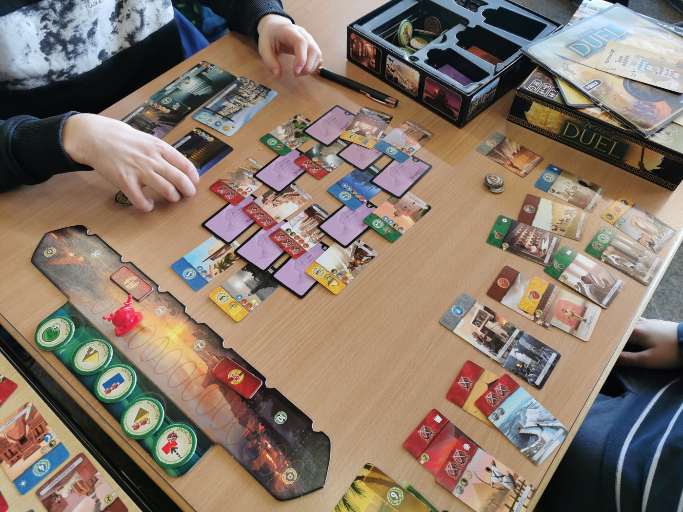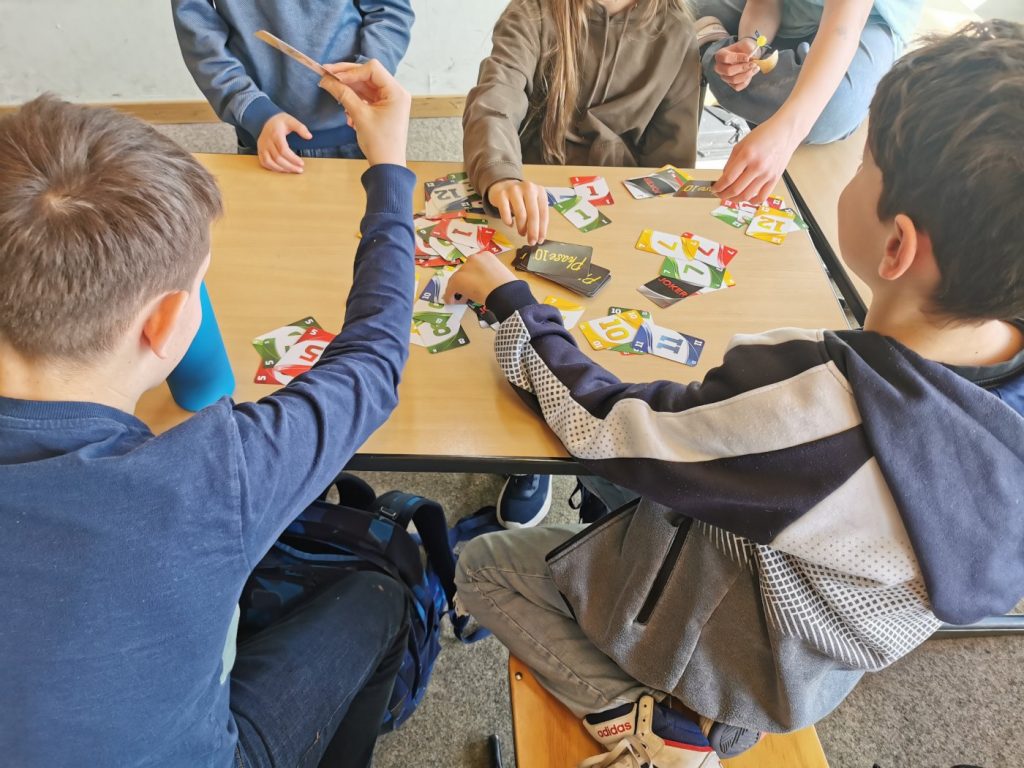 Unsere Klassenpat*innen und 45 Schüler*innen aus den Klassen 5a – d fanden sich um 13.15 Uhr zu unserem ersten Spielenachmittag ein, an dem wir gemeinsam mal wieder ganz ausgiebig Gesellschaftsspiele spielen wollten. Wir hatten eine Auswahl an beliebten Spielen dabei, und viele Fünftklässler*innen hatten ihr Lieblingsspiel mitgebracht. Darunter waren viele Klassiker wie Mensch ärgere dich nicht, Monopoly (Star Wars), Scotland Yard, Schach, Catan, Schiffe versenken, Uno, Werwolf und Phase 10, aber auch neuere bzw. unbekanntere Spiele wie Seven Wonder Duell, Stadt Land Vollpfosten, Sky Team, Taco Katze Ziege Käse Pizza, Take it easy, Dog, Minecraft, Quick Stop, Torjäger und Halli Galli. In einem unserer beiden Klassenzimmer fanden sich kleinere Grüppchen von zwei bis sechs Schüler*innen zusammen und legten gleich mit Feuereifer los. Es wurde erst das Lieblingsspiel gespielt und dann auch mal ein neues spannendes Spiel ausprobiert. Im zweiten Klassenzimmer rätselten andere Schüler*innen im Geheimen, wer unter ihnen harmlose Dorfbewohner und wer gefährliche Werwölfe waren. Unsere Klassenpat*innen mischten sich unter die Spielenden und lernten so auch das eine oder andere für sie neue Spiel kennen. Süßigkeiten und Knabberzeug durften zur Stärkung zwischendurch natürlich auch nicht fehlen. So war es für alle ein kurzweiliger Nachmittag.