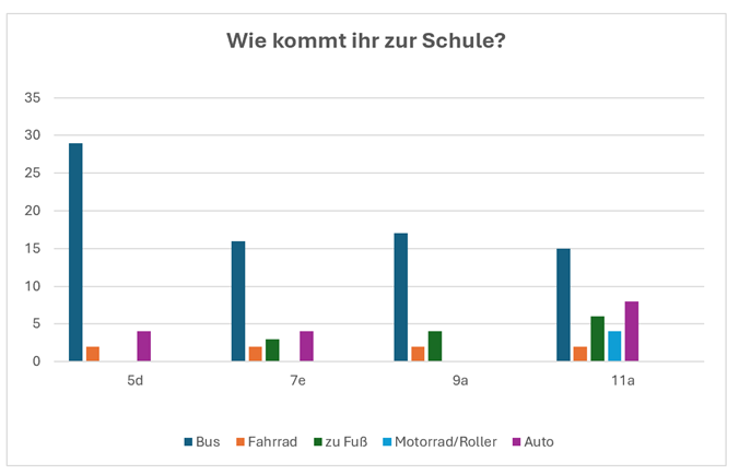 Die meisten Schülerinnen und Schüler (77) kommen mit dem Bus zur Schule. Eigentlich eine gute Sache, denn: Der Bus ist bequem, (überwiegend) zuverlässig und man kann unterwegs noch mit Freunden reden oder einfach Musik hören. Außerdem ist es umweltfreundlicher, wenn viele gemeinsam fahren.