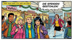 Gerade wollten sie sich eine Pause gönnen, als Frau Lindner, die Sekretärin, aufgeregt auf den Schulhof stürmte. „Die Spenden! Die ganzen Einnahmen sind weg! Alles ist aus dem Tresor im Sekretariat gestohlen worden!“