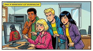 „Wie können wir ihn überführen?“, fragte Sina in die Runde. Max antwortete : „Er war zuletzt in der Sporthalle. Vielleicht können wir dort Hinweise finden.“ Als sie aus dem Sekretariat liefen, liefen sie Ben aus der 8b direkt in die Arme. „Hey Ben, hast Du was mit dem Diebstahl zu tun?“ „Nein, wieso sollte ich? Außerdem kenne ich die Zugangsdaten gar nicht.“ „Dann warst Du es also nicht.“ meinte Sina. Als er weiterging, flüsterte Lucy: „Er ist der Täter!“ „Woher willst Du das wissen?“, fragte Sina. „Naja, er sagte: Er hat die Zugangsdaten nicht.“ Max erklärte: Sina, woher weiß er, dass der Täter Zugangsdaten brauchte?“ „Stimmt!“, Sina verstand es. „Sollen wir die Polizei holen?“