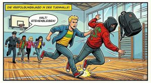 Alle rannten los. Als sie die Tür zur Turnhalle öffneten, hörten sie plötzlich schnelle Schritte. Eine vermummte Gestalt rannte aus dem Geräteraum – mit einem großen schwarzen Rucksack auf dem Rücken!