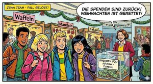 Und so konnte der Weihnachtsbasar doch noch gerettet werden. Die Spendenaktion war ein voller Erfolg. Es wurden sogar noch weitere Spenden eingesammelt – diesmal natürlich unter sicherer Aufsicht von ZSWA.